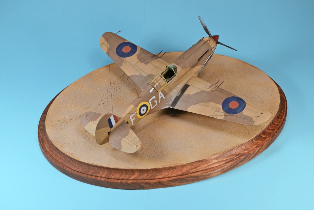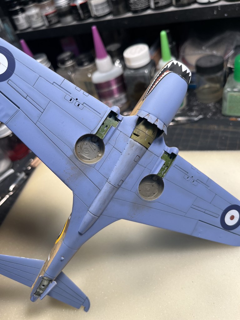 Some airplane enthusiast have their favorite particular plane. As do I. But sometimes it goes further, at least where military aircraft are concerned. I have my favorite camouflage schemes. At the top of the list would be the 1943 USN combination of Dark Sea Blue over Intermediate Blue over white with Insignia Red surround on the national marking. I’ve done that in modeling before so on to the second scheme on the list: WWII RAF desert camo of Dark Earth over Middlestone over Azure Blue. And just to change it up lets throw it on an American aircraft in British service, the Curtiss Tomahawk IIb. The Airfix 1/48 P-40B kit is quite nice, presenting no real issues in construction. To change it to a Tomahawk IIb I filled in the fuselage side position lights, added a Quickboost resin British seat and reflector gun sight, and Master .30 cal. brass wing gun barrels set. I finished it with BarracudaCal decals for Neville Duke’s GA*F in Egypt over Hataka acrylic paints. Again AK chipping fluid was used under the topcoats. MiG panel line washes and pastel chalk exhaust streaks with more light tan pastel overall for paint fade and dust residue. EZ line for the antenna rigging. The underside got some oils and Vallejo mud effects.