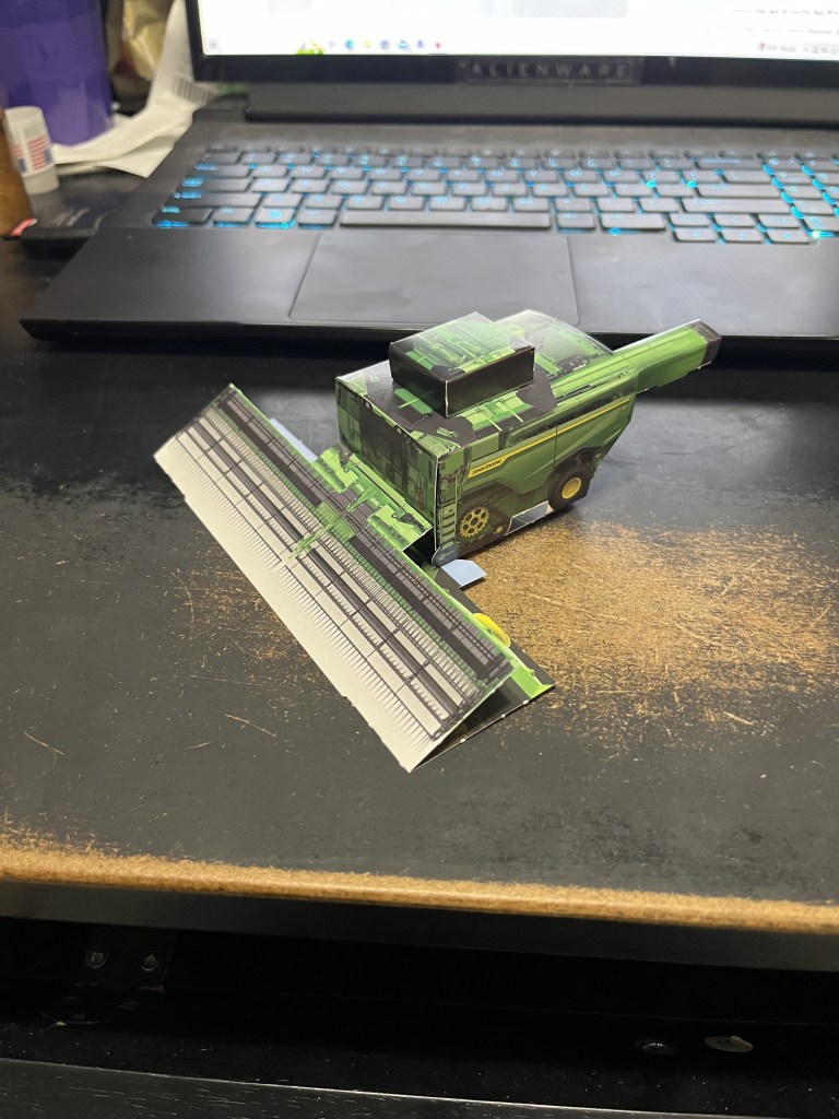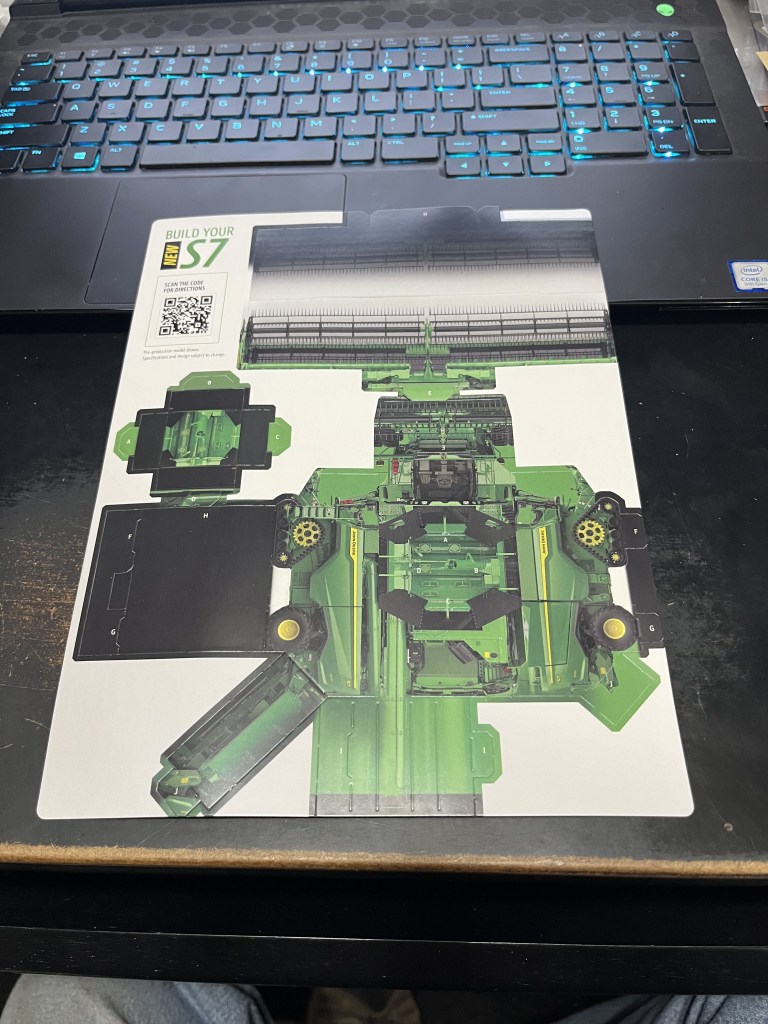 John Deere is getting clever in its mass advertising mailers lately. This is their latest effort in promoting the new S7 series of combine which showed up in my mailbox awhile back. Having never really given much thought to the growing paper model craze until I saw this, I decided why not. Looks too nice to just toss it. After about 15 minutes of angst I did the proper thing and used the QR code to download a short set of instructions. Which by the way still required a good deal of brain power to interpret. Never the less, I prevailed and successfully finished the card model and now it sits on my farm office desk next to the diecast 1/64 toys implement displays. Ladies and Gentlemen, the John Deere S7 combine: