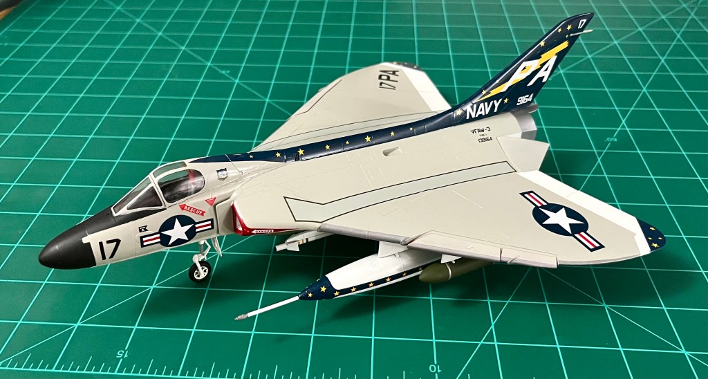 There isn’t much to show on this one. Too late for the contest and well beyond the three footer threshold for a contest entry from me, I pushed this model over the finish line just so it wouldn’t sit in the display case mocking me anymore. I have done better work. I don’t know when I started building the 1/48 Tamiya F4D-1 Skyray, but it is probably well past 10 years. Or more. Tamiya’s decals were difficult to work with and I did a poor job on the dark blue of the vertical and drop tanks. I am also a better painter now than back then. Love the kit and another one is on the list to do again some day with some long out of production aftermarket resin. This build was entirely out of the box only with literally no weathering expended on the effort. It’s still a keeper.